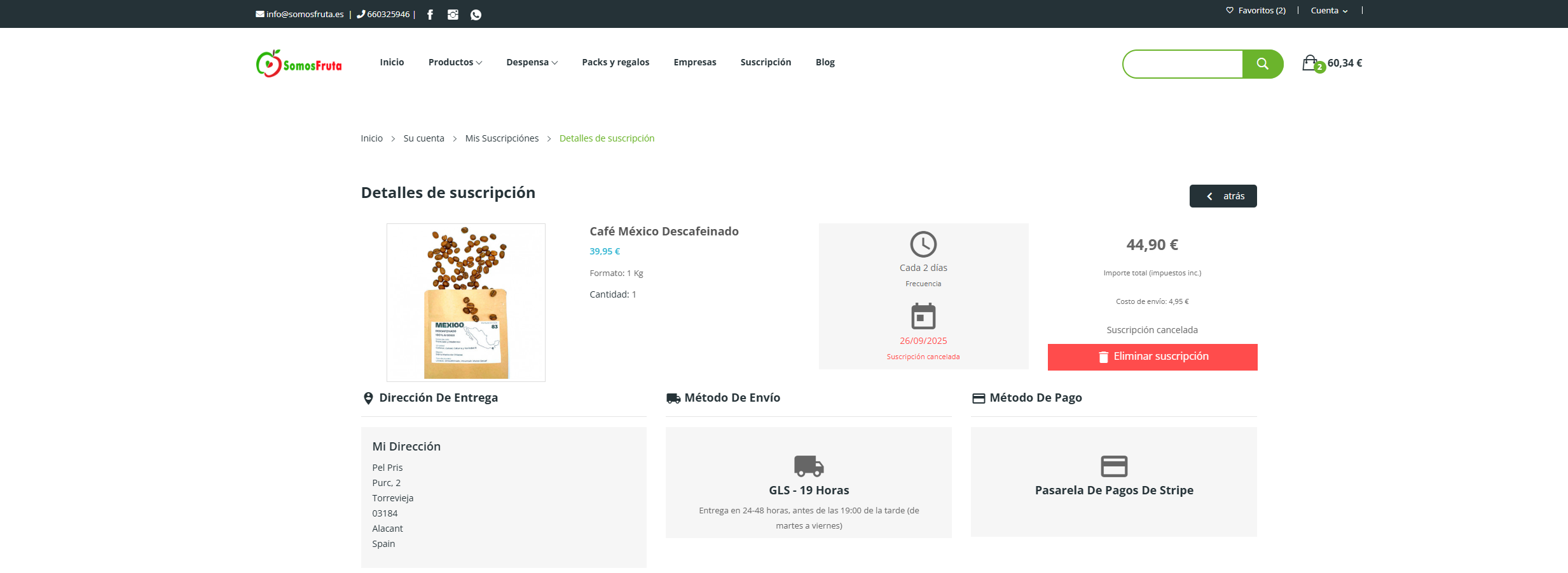 Una vez has finalizado el carrito y vas a pasar por caja, en ese momento aun puedes modificar los datos de la suscripción. Puedes cambiar la frecuencia de la suscripción y la primera fecha de entrega. Al pulsar PASAR POR CAJA ya solo tienes que ir poniendo los datos de facturación, de entrega, el método de envío y la forma de pago.