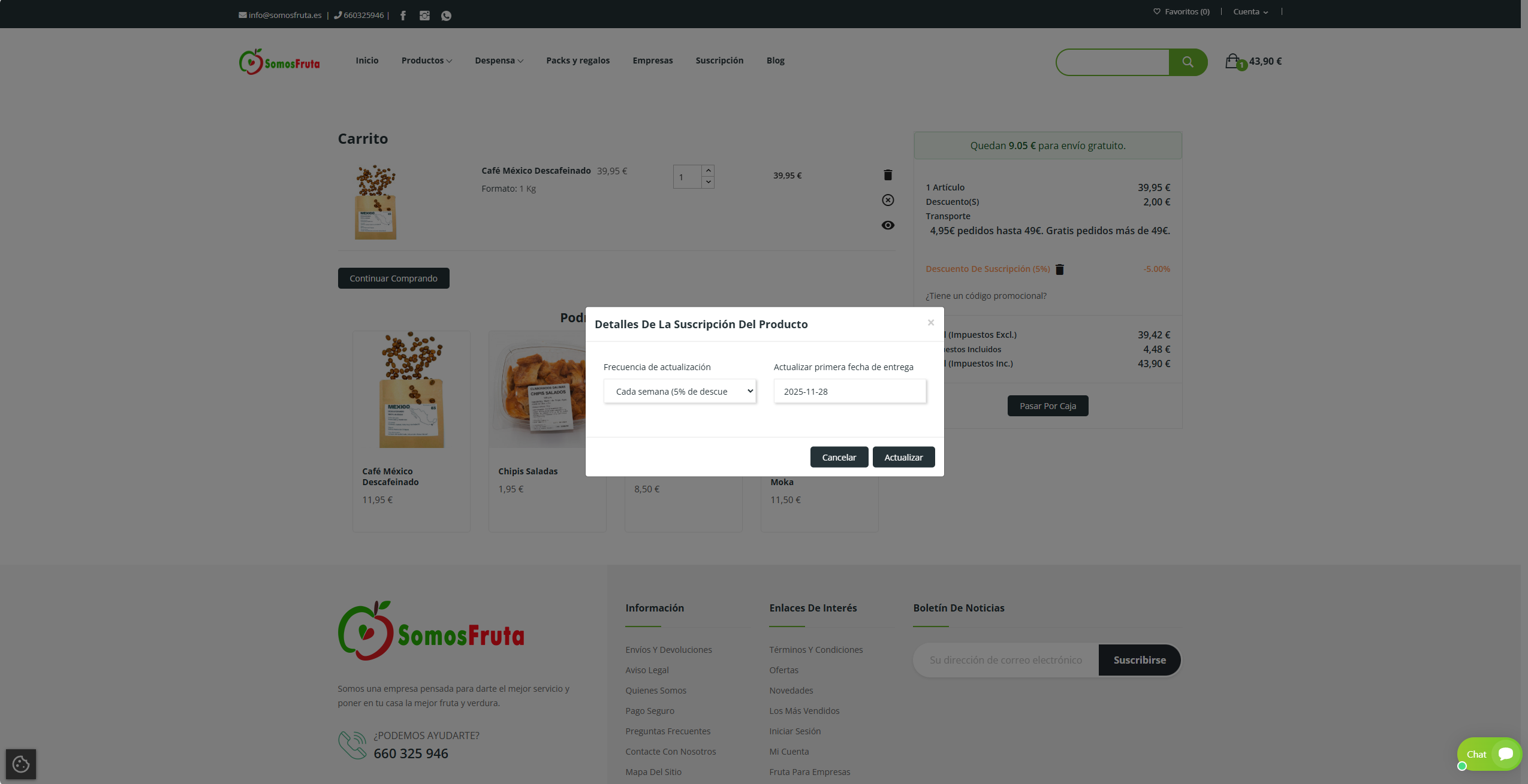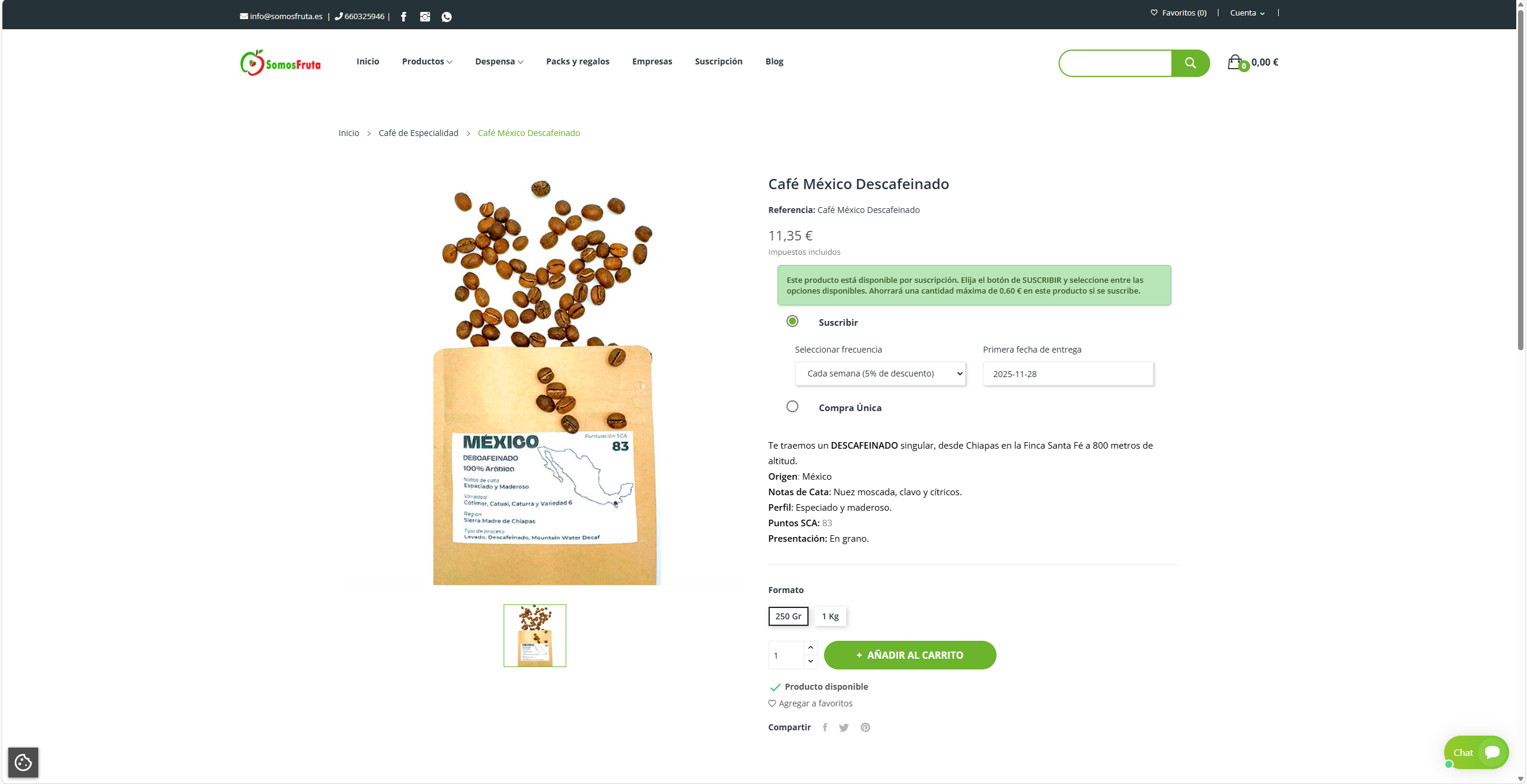 Una vez accedes al producto, deberás elegir el formato (si tiene más de una opción) y después elegir si quieres que sea una compra única o una suscripción. En este caso, deberás elegir la frecuencia del envío y la primera fecha de entrega. Añades al carrito y todo está listo para proceder con el pago. Debes tener en cuenta que las fechas de entrega serán como en toda nuestra tienda de martes a viernes excepto festivos, por lo que si la fecha en la que deseas la entrega o las posteriores caen en lunes, fin de semana o festivo, la entrega se realizará en las siguientes 24-48 horas. Esto es debido a que para mantener la calidad de nuestros productos siempre evitamos que un envío esté un fin de semana o un día festivo retenido en algún almacén de la agencia de transportes.